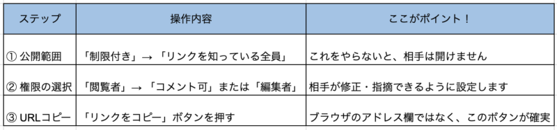 • Googleドキュメント: その文書固有の「URL(リンク)」をチャット等で相手に教える。